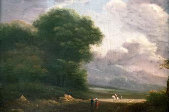 Peintre à la réputation sulfureuse, soupçonné d’avoir défenestré sa compagne, Lazare Bruandet (1755-1804) se cache un temps dans la forêt de Fontainebleau. Il est l’un des premiers artistes à choisir de représenter ce site, en recherchant autant la nature pour elle-même que pour ses effets de pittoresque. Influencé par la tradition des paysagistes hollandais du 17e siècle, il est l’ami de Georges Michel et de Swebach-Desfontaines qui peignent souvent pour lui les personnages de ses paysages. Cette œuvre est remarquable par le traitement dramatique de la lumière.