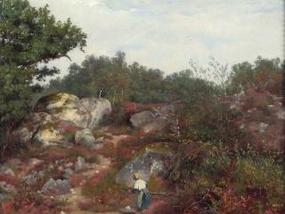 Peintre à la réputation sulfureuse, soupçonné d’avoir défenestré sa compagne, Lazare Bruandet (1755-1804) se cache un temps dans la forêt de Fontainebleau. Il est l’un des premiers artistes à choisir de représenter ce site, en recherchant autant la nature pour elle-même que pour ses effets de pittoresque. Influencé par la tradition des paysagistes hollandais du 17e siècle, il est l’ami de Georges Michel et de Swebach-Desfontaines qui peignent souvent pour lui les personnages de ses paysages. Cette œuvre est remarquable par le traitement dramatique de la lumière.
